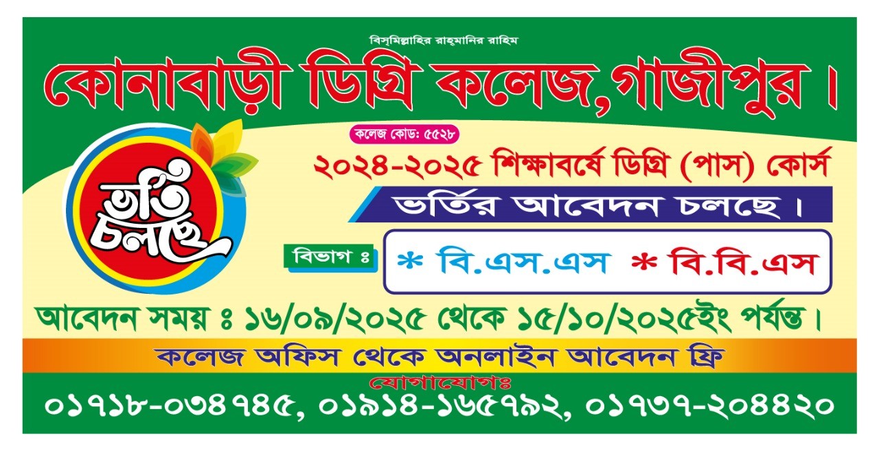 Copyright @ কোনাবাড়ী ডিগ্রি কলেজ, ডাকঘর:কোনাবাড়ী, গাজীপুর মহানগর, গাজীপুর-১৩৪৬