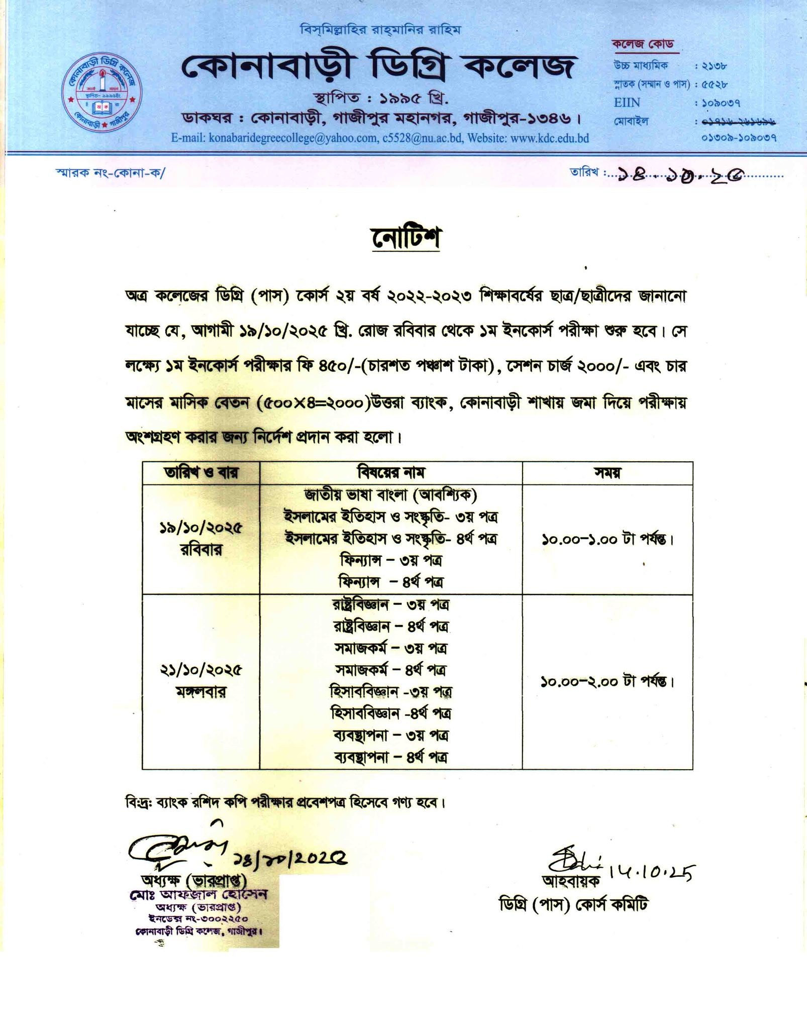 ডিগ্রি (পাস) ২য় বর্ষ (২০২২-২৩ শিক্ষাবর্ষ) ইনকোর্স পরীক্ষা ১৯/১০/২০২৫ ও ২১/১০/২০২৫খ্রি. তারিখে অনুষ্ঠিত হবে