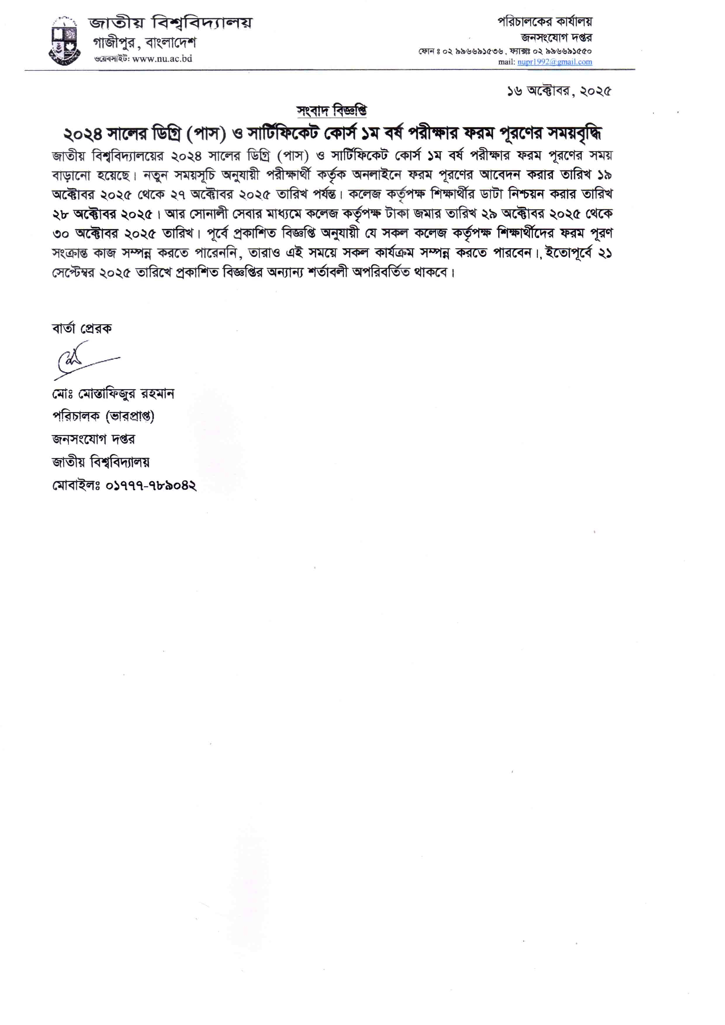 ২০২৪ সালের ডিগ্রি (পাস) ১ম বর্ষ পরীক্ষার ফরম পূরণের সময়বৃদ্ধিঃ ১৯/১০/২০২৫ থেকে ২৭/১০/২০২৫ তারিখ পর্যন্ত