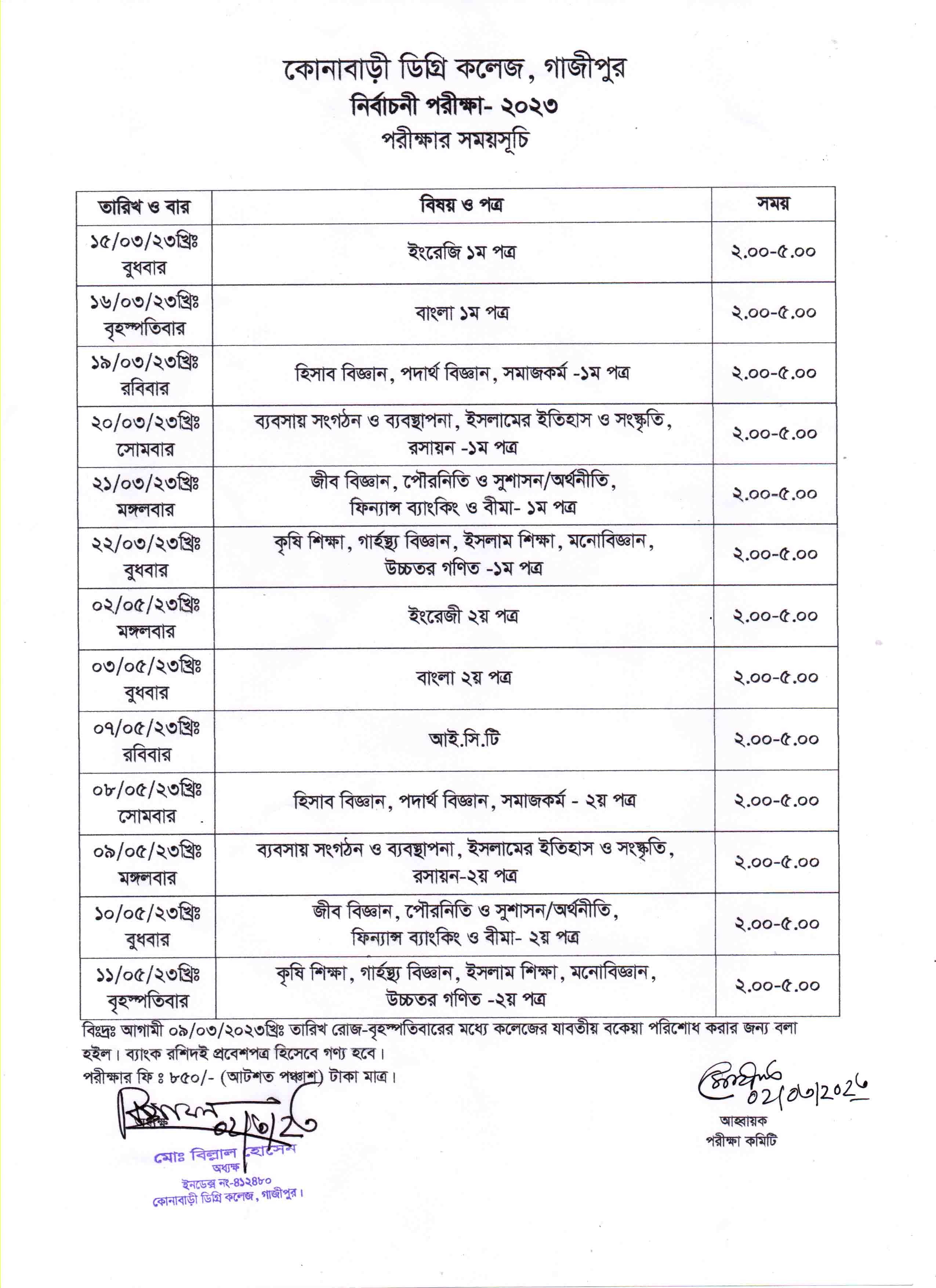 ০২/০৩/২০২৩খ্রি. নির্বাচনী পরীক্ষার সময়সূচী
